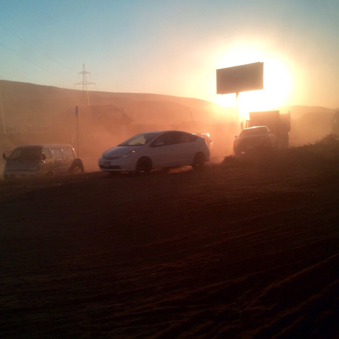 The high-rise buildings and hummers soon gave way to sprawls of dirt-track suburbs, with combinations of gers and brick houses at various stages of construction. The movement from nomadic existence to more permanent living was evident, and at every turn you could feel the city groaning under the speed of construction, as resources and space were stretched to breaking point. Sometimes beyond: we regularly had to swerve off the road and into the dust to avoid jack-knifed lorries and pot holes mid-repair. Rebecca, as ever, still had no problem catching some zeds in the minivan.