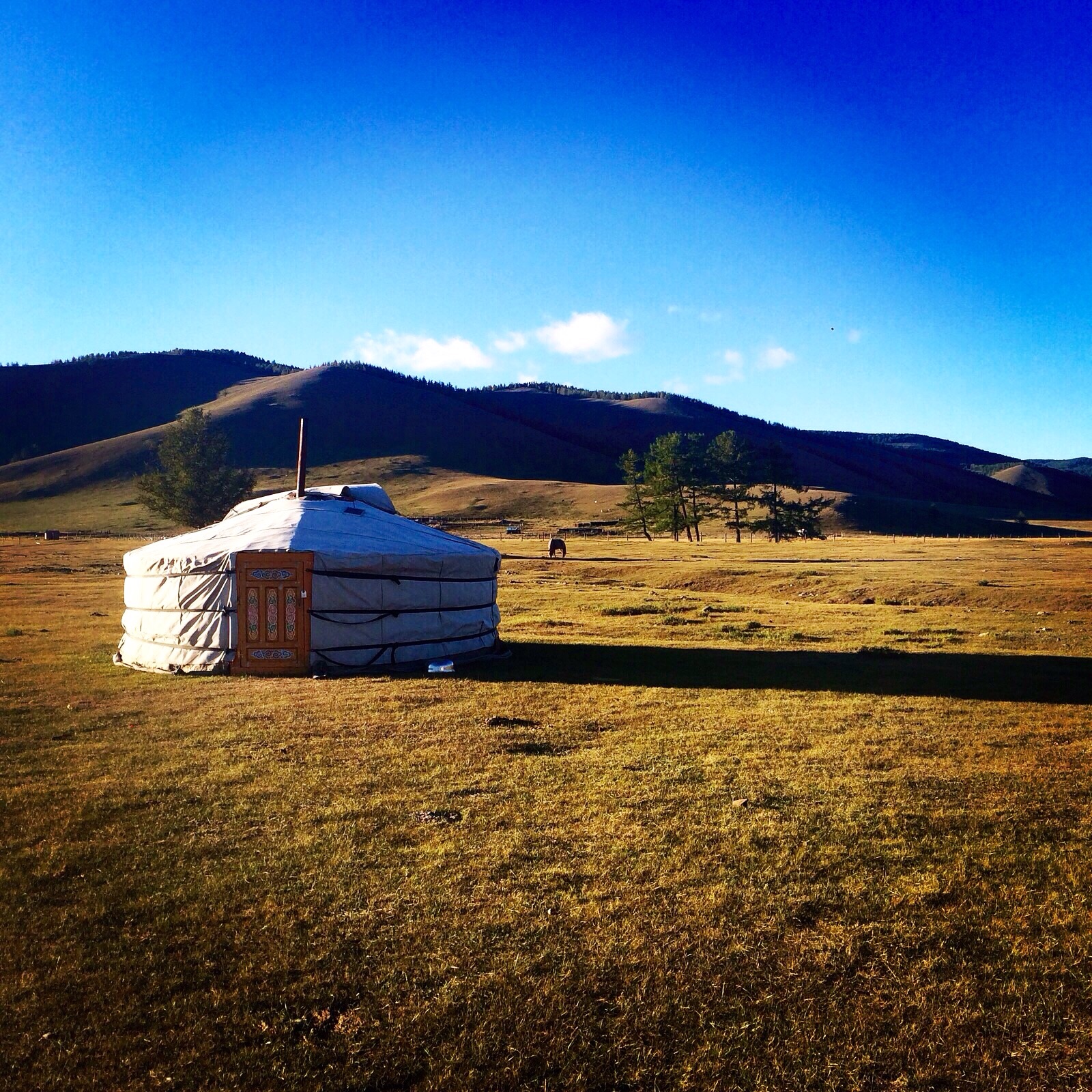 Four white dots in the middle of the grassy expanse of Mongolian rolling hills, our camp consisted of a couple of horses, a shack with a hole in the ground for a toilet, three dogs, and a row of four gers. The one belonging to our host family, Davasuren and Yadmaa, stood out both in size and, particularly, because of its solar panel and satellite dish.