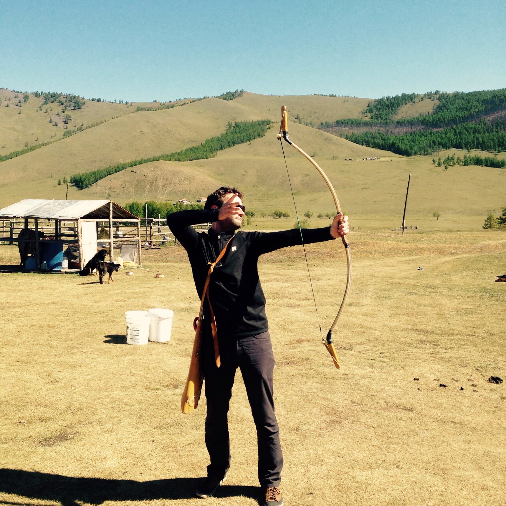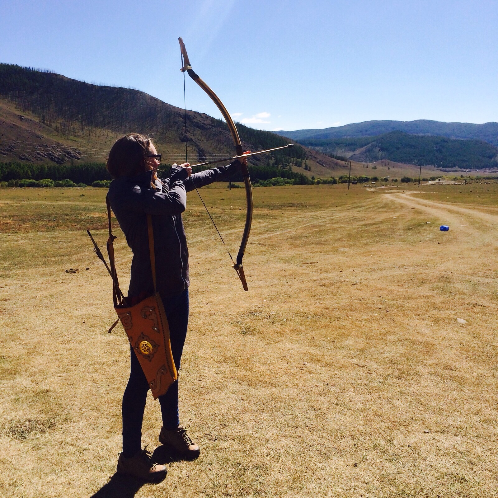 Our ger was spacious and more decorative than we’d expected. There was minimal furniture; just a couple of beds around the edge, a low table and stools with a flask of hot water for making tea, and a wood-burning stove in the centre. On the table was a very short set of instructions; go wherever you like and if you want something just ask Davasuren or Yadmaa. After realising that ‘horse’ and ‘Mongolian’ had exhausted the family’s English vocab, the rest of our communication with them was an exaggerated game of charades. They did try to teach us ‘thank you’ in Mongolian, though all seemed to pronounce it differently and our attempts just set them into fits of giggles. Later that morning our archery skills had a similar effect…