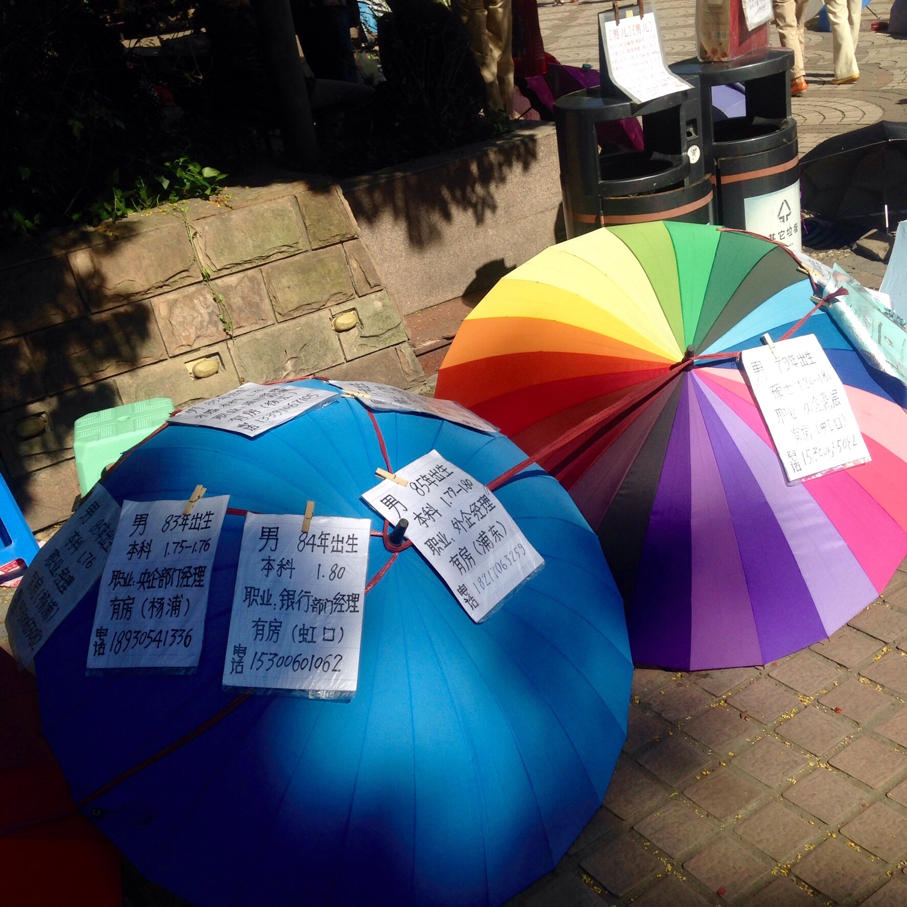 Finding a spot to eat them proved tricky at first as the corner of the park we’d chosen was completely packed. First we thought it was a market, but there didn’t seem to be any stalls. The paths were lined with umbrellas each with a notice pinned to the front. Maybe a protest? But everyone seemed to be milling about quite happily. Then we realised it was in fact a market, of sorts. The Shanghai marriage market! Everyone was aged about 50-60 and were there with adverts for their eligible children!