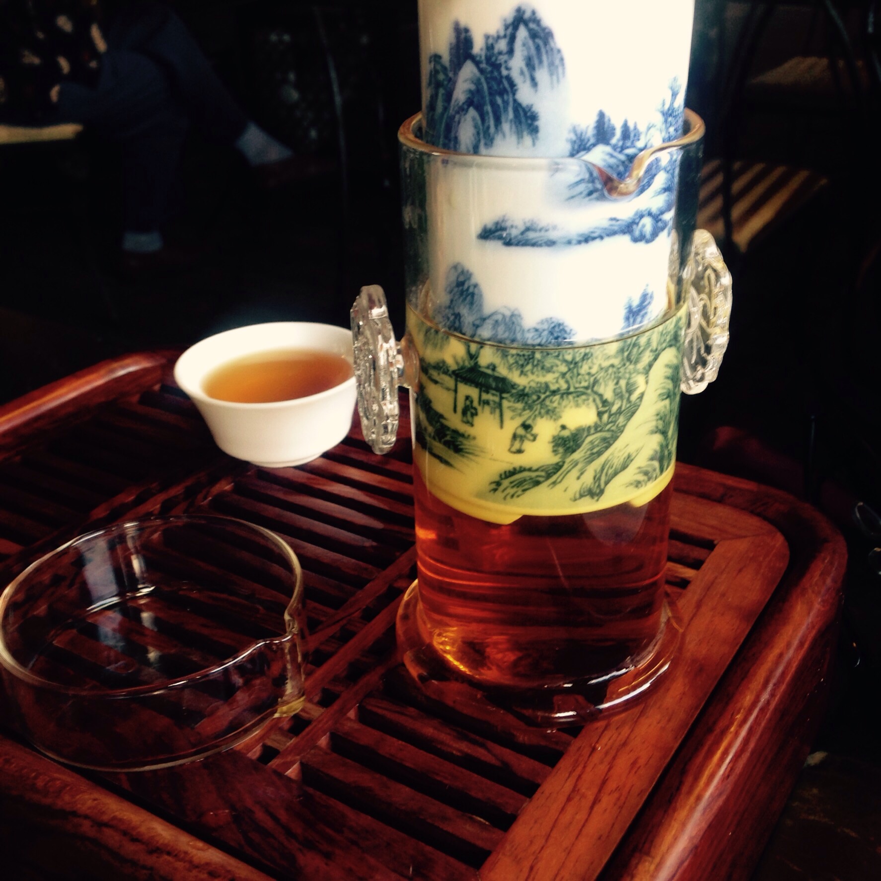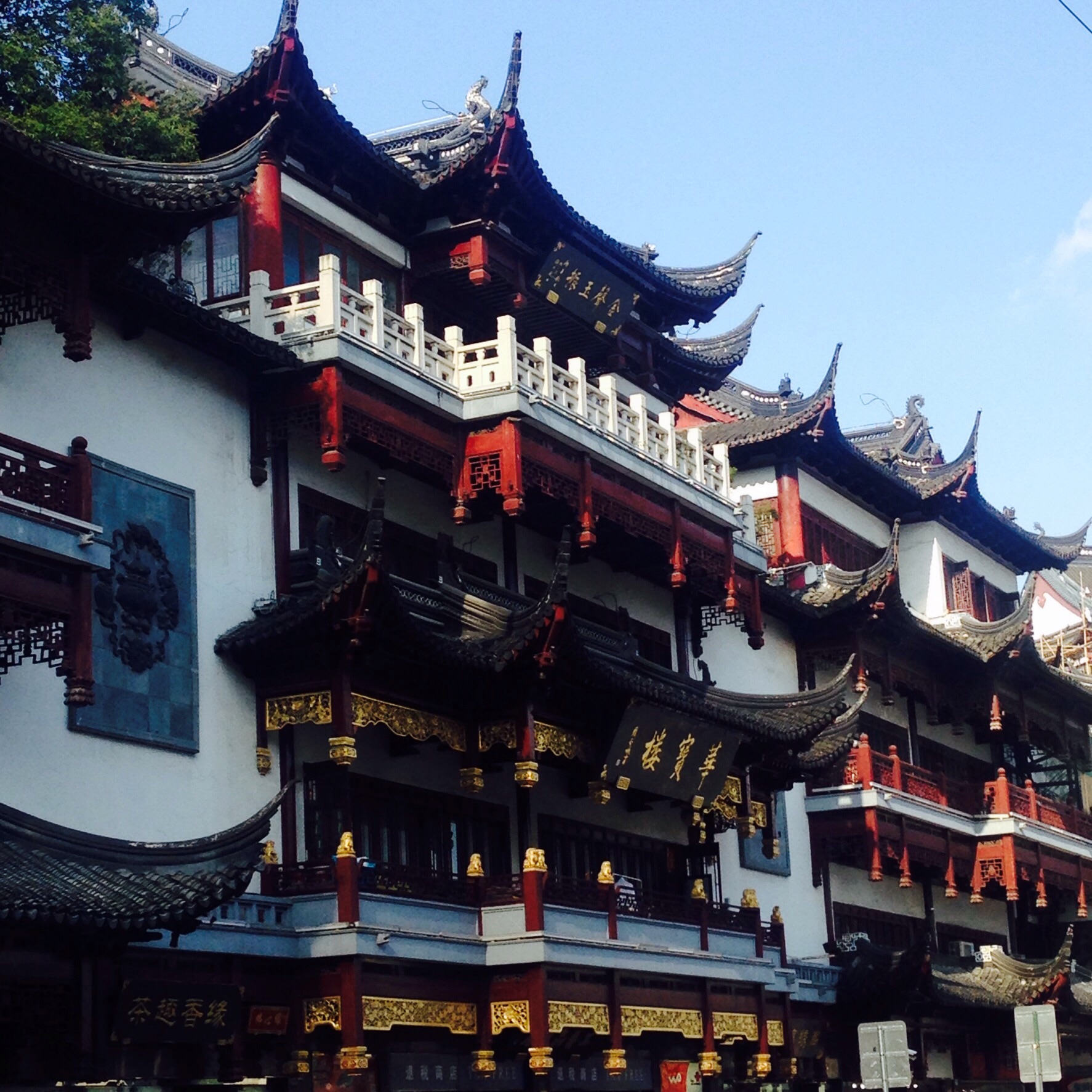 The Old Town, as you’d expect, shows a different side of the city to the new skyscrapers and shopping malls. Middle Fangbang Road is lined with small one-storey shops, tea rooms, and traditional curved roofs. We stopped at Old Shanghai Teahouse on the way back up to the river, and had a not-so-authentic experience when, after the hostess had immaculately delivered the tea service and daintily poured the first glass, the hapless-go-lucky trainee waiter shows up and proceeds to pick up each item and then pour most of the tea onto the table. With a look of complete incredulous disbelief as he does so. Baffled, he shrugged and left us to our tea and the traditional live music.