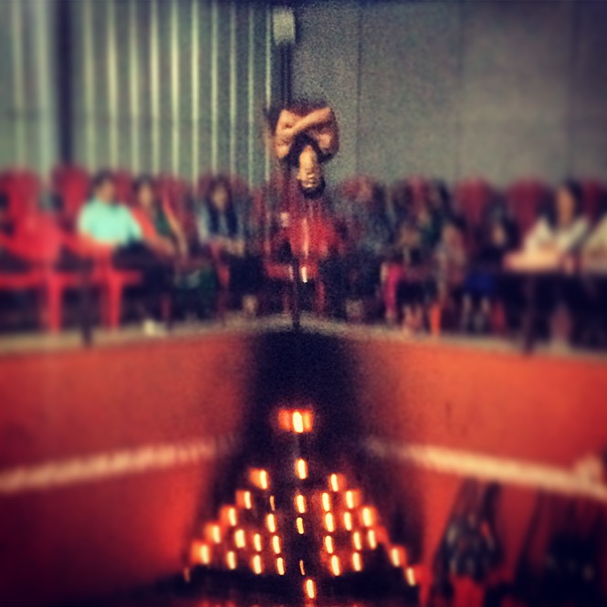 The Kalaripayattu performance was incredible, though thankfully nobody in the audience tried to copy. These guys also moved at superhuman speeds, but in this case leaping towards each other armed with spears, staffs and swords, or leaping head first through hoops of fire. We did try to take pictures… these are the best of a very blurry bunch.