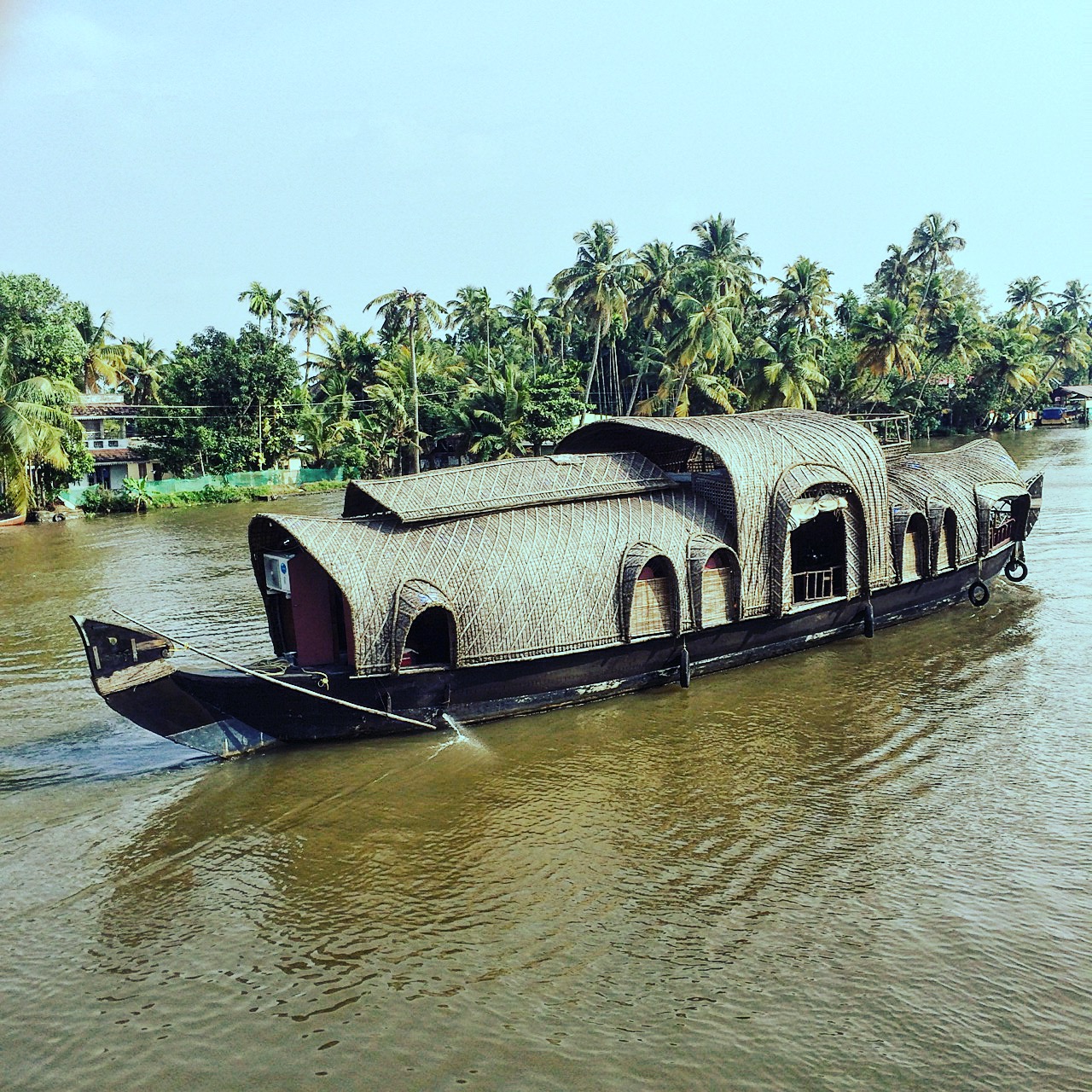 Having read a couple of blogs about finding a houseboat we knew that if you turn up and choose on the day there is a bit of a lottery between landing either an absolute dreamboat or an absolute rust bucket. We booked ahead with Lakes and Lagoons, not only because they were at the dreamboat end of the scale, but mainly because their boats have the all-important upper deck. From here, you have a great vantage point for photos of life on the backwaters and a bit of extra privacy from the captain and crew working on the lower deck. The boat is based on the traditional Kettuvalam boats of Kerala and is made using bamboo poles, coconut fibre, palm leaves, and a cashew oil coating. Unlike the traditional boats, though, our bedroom had a king-size bed, a hot shower and A/C.