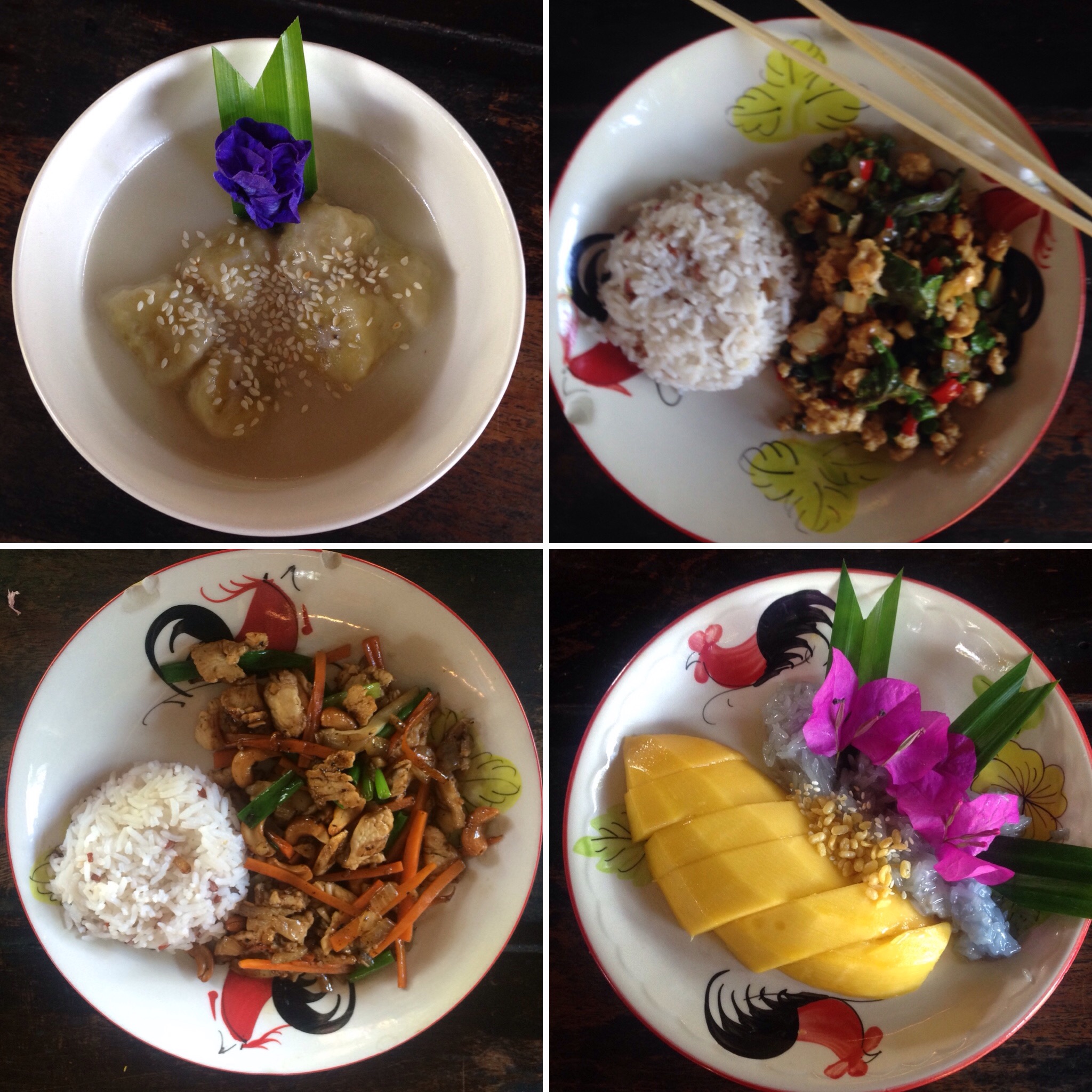 We cooked inside a converted barn next to the vegetable and herb gardens, each at an individual cooking station. We made six dishes and ate together outside after each dish. Our teacher’s hilarious brand of instruction will definitely make some things easy to remember. Should you stir the bananas when they’re caramelising? No; “Shake your bananaaaaaaas!” Was Rebecca’s first spring roll attempt the right size? No; “Toooooooo loonnnnngggg!” After tom yam soup, red curry, yellow curry, pad thai, chicken and basil, spring rolls, chicken and cashew nuts, coconut bananas, papaya salad and mango sticky rice all made in quick succession, we’ll definitely need the recipe book we were given at the end to avoid ending up with a Thai version of the Friends episode when Rachel attempts trifle.