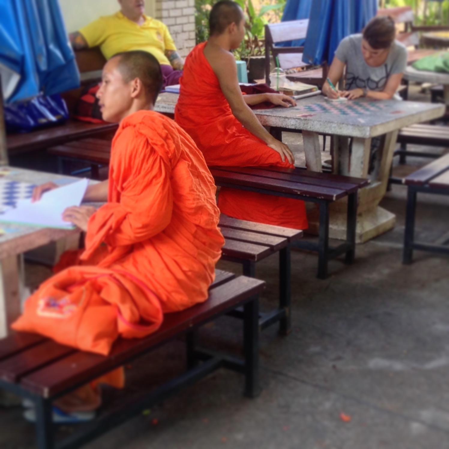 Obviously, as soon as we saw a sign saying ‘Monk Chat’, we needed to know more. At picnic tables in the shade of trees outside a temple, Buddhist monks who want to practice their English come to chat with people about Buddhist beliefs, a monk’s life, Thai culture, or anything else. We chatted with a monk who’d recently graduated from Novice to Monk status. He considered himself somewhere between a forest monk and a city monk; he studied a temple in Chiang Mai, but his ‘home’ temple was in a nearby village. Every morning, along with the other monks in his temple, he wakes up at 5am for prayers, then joins the morning alms procession. As Buddhist monks cannot have their own money or possessions, they rely on offerings from citizens for their two daily meals. At dawn, local people line the streets near the temples to receive blessings in exchange for their offerings. Apparently rural monks are usually given sticky rice but people in cities don’t always have time to prepare food so instead offer the monks money to buy breakfast. This explained the queue of monks we saw at a 7-Eleven one morning!
